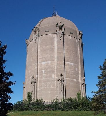 De Washburn Park Watertoren bereikt een hoogte van 34 meter en heeft een cilindrische koepel met acht sculpturen van gemantelde ridders.