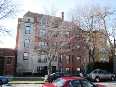 Het Hermitage Apartments gebouw heeft vijf verschillende secties met gevarieerde raamafmetingen, kalksteen- en baksteengevels op 4606 North Hermitage Avenue.