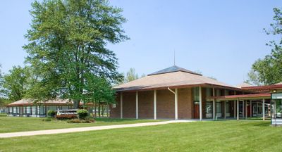 Het gebouw weerspiegelt de visie van architect John Carl Warnecke om onderwijsruimten te integreren met het agrarische landschap van Indiana door piramidevormige daken en verbonden modules.