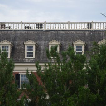 Het tweeënhalve verdieping tellende bakstenen gebouw heeft een mansardedak met een gebalusterd terras en een middendeel met vijf traveeën.