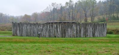 Fort Necessity is een rond palisadefort met een diameter van ongeveer 16 meter, omgeven door verdedigingswerken en trinchees met een centraal opslaggebouw. Een bezoekerscentrum in de buurt geeft context over deze militaire installatie.