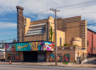 Het Ambassador Theater aan Liberty Heights Avenue heeft een opvallende Streamline Moderne voorgevel met twee verticale pylonen omgeven door horizontale baksteenstrepen. Dit geometrische ontwerp geeft het gebouw een zeer kenmerkend uiterlijk.