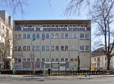 Het Institut für vergleichende Irrelevanz bevindt zich in een gebouw uit 1953 nabij het Senckenberg Museum, met architecturale elementen beschermd door Duitse wetgeving.