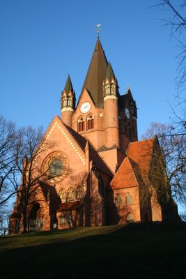 De Pauluskirche heeft een kruisvormige indeling met een centrale toren van 60 meter en vier kleinere torens in Noord-Duitse baksteengotiek.