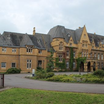 Kasteel Halberg staat op de westelijke helling van de Halberg, met neogotische architectuurelementen en een landschapspark.