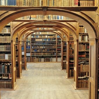 De bibliotheekzaal bevat architectonische elementen uit het baroktheater, met triomfbogen die de presentatieruimtes verdelen.