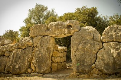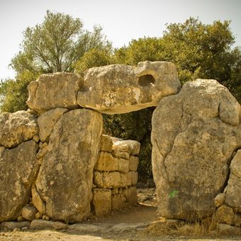 De monumentale toegangspoort gebouwd met cyclopische steenblokken toont een bijzonder voorbeeld van Talayotische architectuur op de Balearen.