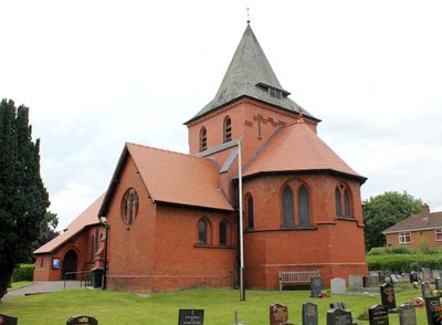 De kerk van rode Ruabon-baksteen heeft een centrale toren met torenspits, dubbele lancetvensters en een veelhoekige apsis met pannendak.