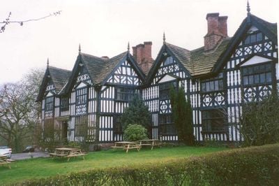 Het Old Hall Hotel is een houten vakwerkgebouw in Sandbach met stenen dakpannen, bakstenen schoorstenen en gesneden houten topgevels. Een later toegevoegde tuinkamer met terrastoegang dient nu als eetgedeelte.
