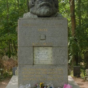 Na zijn dood in 1883 werd Marx eerst elders begraven, maar in 1954 werden zijn stoffelijke resten hierheen gebracht. Het nieuwe monument werd in 1956 onthuld door Harry Pollitt en verving een bescheidener grafsteen.