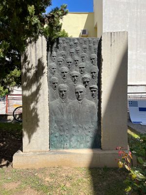 Memorial to the 200 of Kaisariani, 1 May 1944, bronze and stone memorial by Praxiteles Tzanoulinos, Kaisariani, Greece