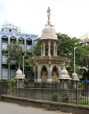 De Mulji Jetha Fontein is een decoratieve waterkering in het Fort-gebied met rode granieten pilaren die een gewelfd dak ondersteunen. De top toont diervorming waterspuiers en gedetailleerde Indische siermotieven.