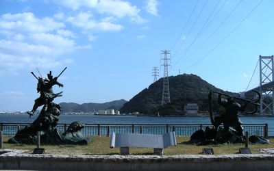 Stenen monumenten en standbeelden van Minamoto no Yoshitsune en Taira no Tomomori tonen de historische figuren van middeleeuws Japan.