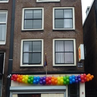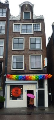 Pand, bestaande uit een hoger opgetrokken voorgedeelte aan de Amstel en een langwerpig achterhuis langs de Bakkerstraat, waarin een eigen toegangsdeur met stoep