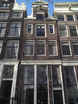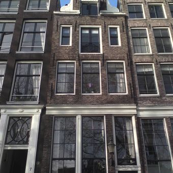 Pand met gevel onder rechte lijst met goede roedenverdeling op de verdiepingen