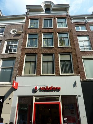 Pand met gevel onder vernieuwde, in het midden verhoogde lijst met neo-renaissance-consoles, Rijksmonument op Kalverstraat 173