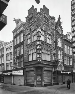 Aardig gecomponeerd hoekpand in neo-gotische en renaissance vormen, met twee trapgevels, een beeld onder baldakijn, een gebeeldhouwd fries en een torentje, Rijksmonument op Kalverstraat 190