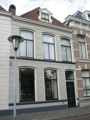Rechter gedeelte van een pand met gepleisterde lijstgevel onder dwars schilddak met hoekschoorstenen