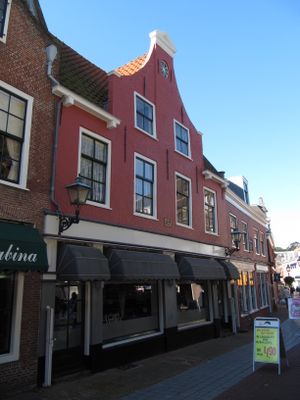 Pand met fraaie gevel met in midden hoog oprijzende topgevel, zadeldak eveneens in topgevels eindigend