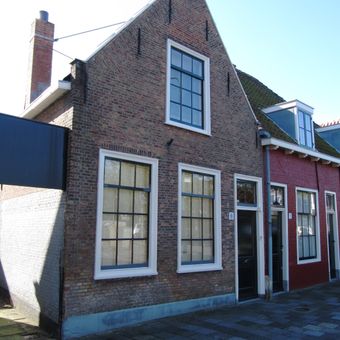 Pand zonder verdieping. Hoog schilddak met de nok evenwijdig aan de straat