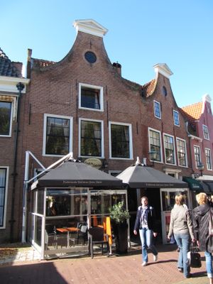 Pand met fraaie gevel met in midden hoog oprijzende topgevel, zadeldak eveneens in topgevels eindigend