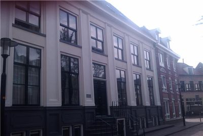 Breed woonhuis, ontstaan door samenvoegen van drie vrij smalle huizen achter een brede bakstenen gevel met hardstenen geprofileerde plint en houten kroonlijst van omstreeks 1730