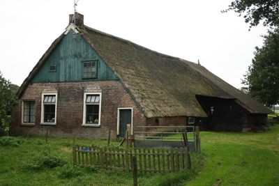 Boerderij met zijbaander onder rieten wolfsdak met toef, Rijksmonument op Van Helomaweg 23