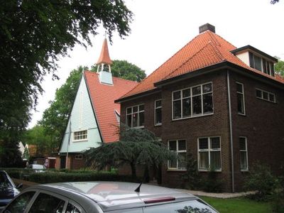 Het houten kerkgebouw aan de Sparrenlaan heeft een steil dak, klokkentoren en traditionele architectuurelementen volgens de stijl van de Amsterdamse School.