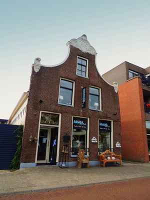 Fors pand met verdieping en twee zolders onder diep zadeldak tegen puntgevel