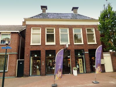 Vijf traveeën breed pand met verdieping en forse kroonlijst onder schilddak met twee hoekschoorstenen waarop borden, Rijksmonument op Hoofdstraat 74