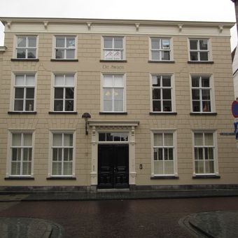Herenhuis met in de gevel overvloedige toepassing van hardsteen voor waterlijsten, versiering boven de vensters en middenfronton in de verdieping