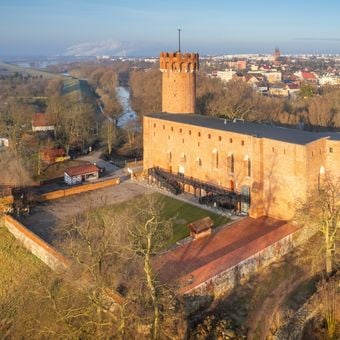 Świecie Castle is een vesting gelegen tussen de rivieren de Vistula en de Wda, met vier cilindische torens op de hoeken en dikke stenen muren in gotische stijl. Het bouwwerk toont typische kenmerken van middeleeuwse militaire architectuur met versterkte verdedigingsposities.