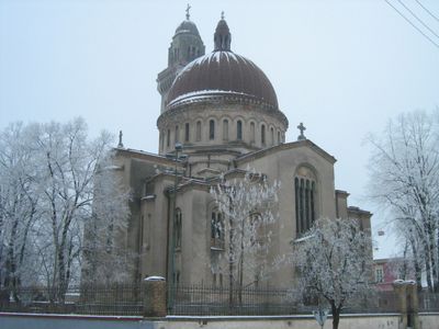 De Transfiguratiekerk heeft twee hoofdtorens, een centrale koepel en vertoont Byzantijnse architectuur met Romaanse en Gotische elementen.