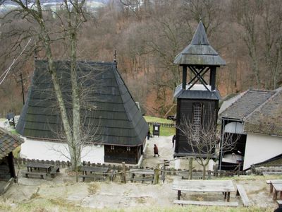 Twee houten poorten met dakspanen leiden naar het kerkterrein, waar een oude begraafplaats karakteristieke grafstenen toont naast een etnografisch museum.
