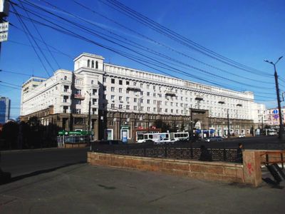 Residential building of the Chelyabinsk city executive committee, Constructivistisch wooncomplex aan de Kirovastraat in Tsjeljabinsk, Rusland.