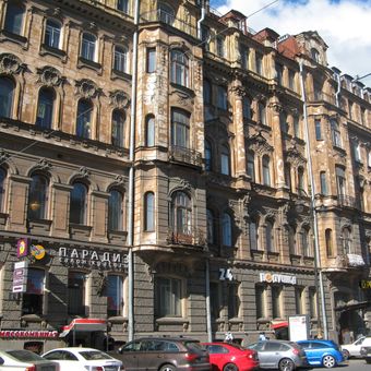 Het gebouw ligt nabij metrostation Chernyshevskaya, bevat meerdere wooneenheden en behoudt zijn oorspronkelijke overdekte galerijen.
