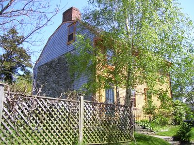 Gelegen aan 2 Wilbur Avenue nabij Bliss Road, behoudt het particuliere huis zijn originele structurele elementen en stenen bouwmaterialen.