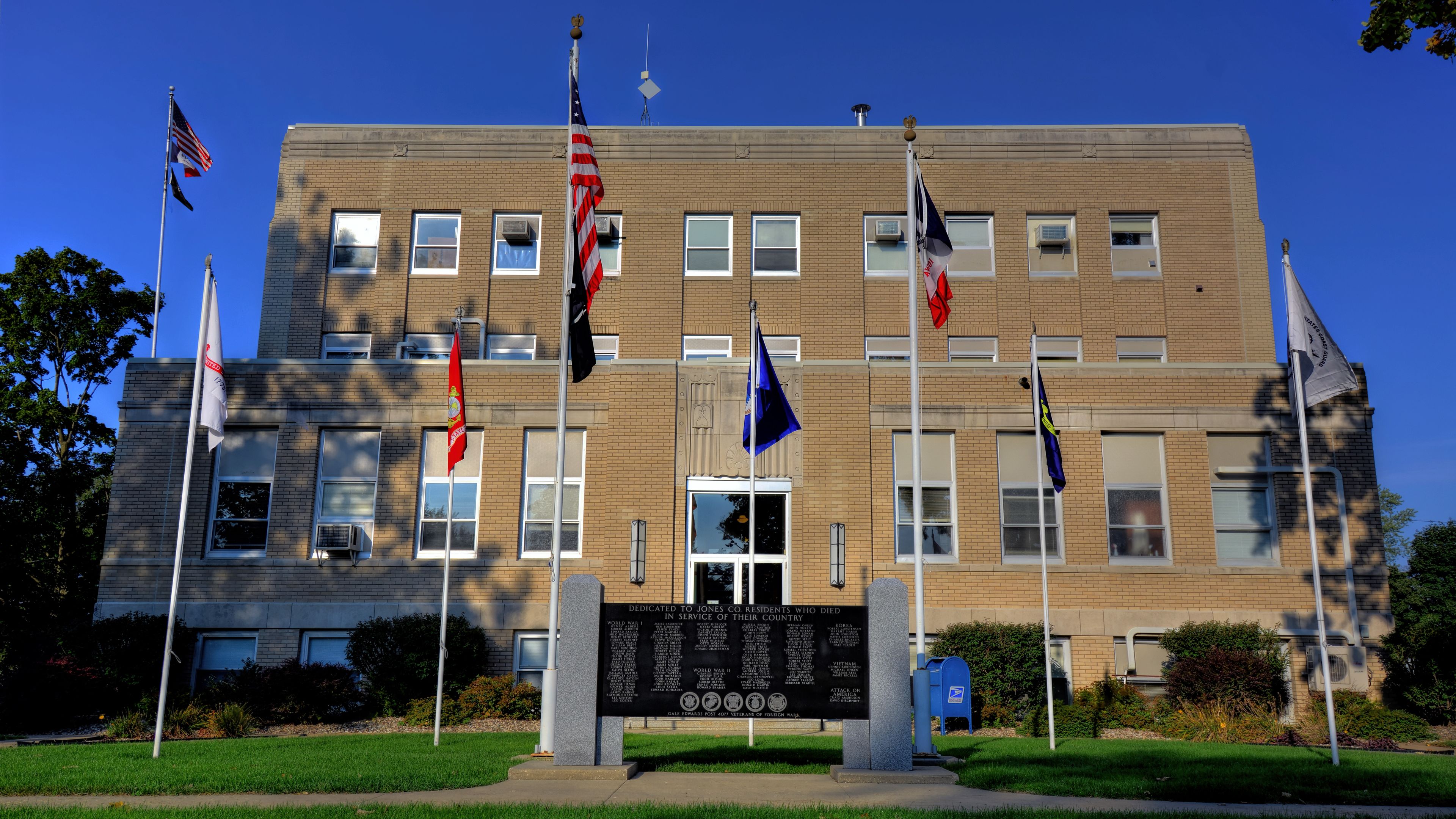 Het Jones County gerechtsgebouw heeft beige bakstenen muren, Bedford kalksteen ornamenten en drie verdiepingen op een verhoogde kelder.