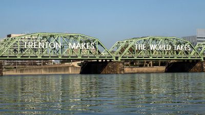De brug toont de verlichte tekst 'Trenton Makes The World Takes' aan de oostzijde, wat het industriële erfgoed van de regio vertegenwoordigt.