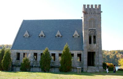 De granieten kerk staat aan de rand van het Wachusett-reservoir, met hoge ramen en blootgestelde binnenmuren zonder dak.