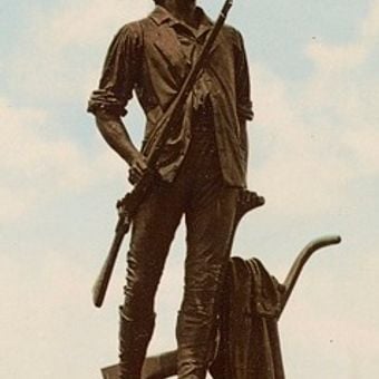 Minute Man is een bronzen figuur bij Old North Bridge in Concord, Massachusetts, die een koloniale milieman op ware grootte toont terwijl hij zijn landbouwgereedschap neerlegt en zijn musket oppakt. Het beeld staat op een granieten voetstuk en kijkt over de rivier richting de historische brug, omringd door open weiden en oude bomen.