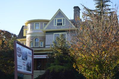 De residentie combineert Queen Anne en Victoriaanse architectuurelementen, inclusief een omlopende veranda ondersteund door gekoppelde Ionische zuilen met traliewerk balustrades.