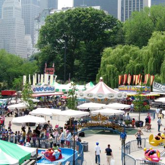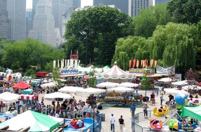 Families verzamelden zich bij Victorian Gardens voor seizoensgebonden entertainment, wat een zomertraditie creëerde in de stedelijke omgeving van Manhattan.