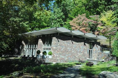 Het huis van 330 vierkante meter heeft muren van lokale Pennsylvania-veldsteen, grote ramen en een trapeziumvorm gebouwd tegen een steile helling boven de zijrivieren van Jericho Creek.