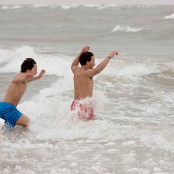 Elke eerste januari nemen honderden deelnemers deel aan de Polar Bear Plunge bij Bradford Beach, zwemmend in het koude water.