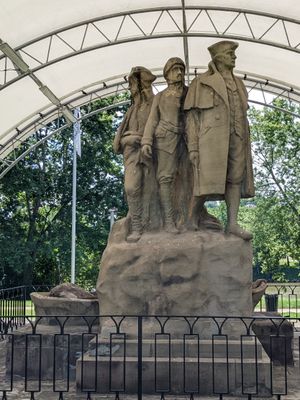 Start Westward Memorial, Zandstenen herdenkingsbeeld in Muskingum Park, Marietta, Verenigde Staten