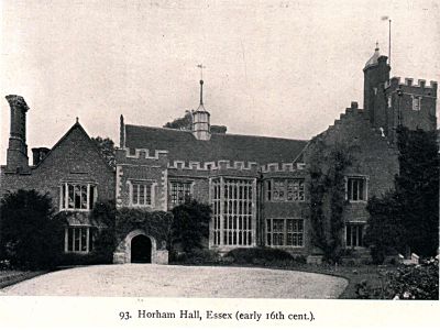 Horham Hall is een landhuis nabij Thaxted dat baksteenbouw combineert met vakwerk en fraai uitgebouwde ramen, vooral aan de zuidzijde. Het gebouw integreert materialen uit verschillende bouwfasen en toont zichtbare dakbalken die kenmerkend zijn voor de oudere delen ervan.