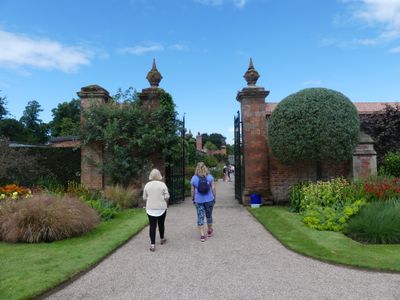 Walls with pair of gates and overthrow, central, along southern boundary of walled garden