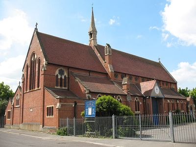 De Hemelvaartskerk staat aan Baxter Road in Custom House, met traditionele kerkelijke architectuur van rode baksteen en spitse ramen.