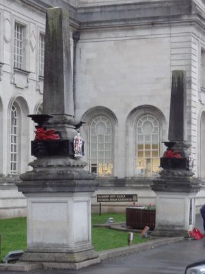 Pair of Obelisk Lamp Stands to SW of City Hall, Grade II listed building in City and County of Cardiff. To left (SW) of main entrance to City Hall